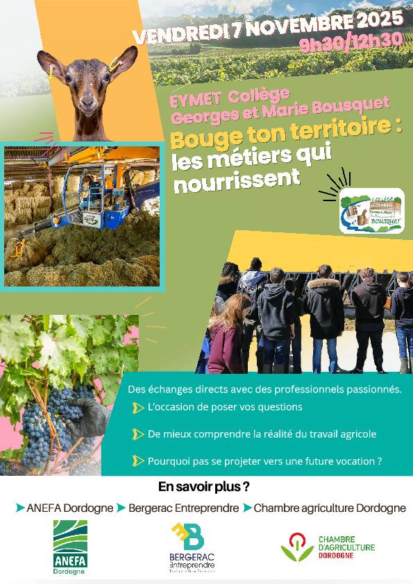 Grâce à la collaboration entre l 'ANEFA Dordogne, Bergerac Entreprendre et la Chambre d'Agriculture de la Dordogne et le collège d'Eymet, une matinée de rencontre entre les acteurs de la vie agricole et les élèves de 4ème et 3ème a pu voir le jour.
