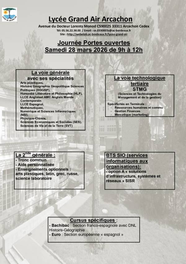 Situé dans la ville d’hiver d’Arcachon, au milieu de la pinède (17 ha de terrain), le lycée Grand Air est l’unique lycée général et technologique du Sud Bassin d'Arcachon. Il a été créé en 1939, lorsque le proviseur du Lycée Montaigne, voulant mettre à l’abri les élèves de son lycée, décida de faire de quelques villas de la ville d’Hiver une annexe de son lycée. Ce n’est que le 23 mars 1952 que le lycée sera officiellement inauguré.