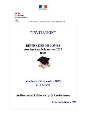 Le Lycée des Métiers Côte Basque Ramiro Arrue de Saint-Jean-de-Luz est heureux de convier les anciens élèves de 3e Prépa-Métiers ayant obtenu leur Diplôme National du Brevet – Série Professionnelle à la cérémonie de remise officielle de leurs diplômes.