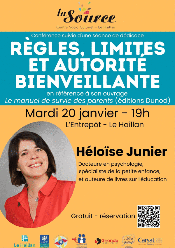 Nous organisons une conférence sur le thème "Règles, limites et autorité bienveillante" par Héloïse Junier, en référence à son ouvrage "Le manuel de survie des parents".