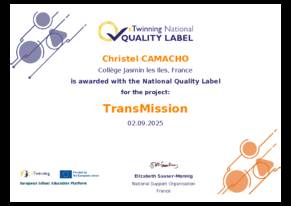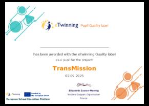 L'équipe d'enseignants et les élèves de la 4ème 2 de la promotion 2024-2025 sont fiers de vous annoncer qu'ils ont obtenu un Label De Qualité National pour le projet eTwinning intitulé TransMission qui a été mené tout au long de l'année passée avec des écoles espagnoles, italiennes, portugaises, turques et roumaines.