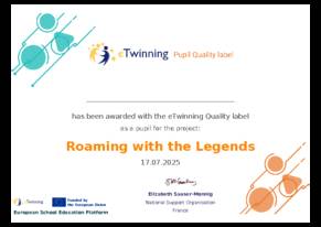 L'équipe d'enseignants et les élèves des 6ème 1,2 et 3 de la promotion 2024-2025 sont fiers de vous annoncer qu'ils ont obtenu un Label de qualité National pour le projet eTwinning intitulé Roaming with the Legends qui a été mené tout au long de l'année dernière avec des écoles grecques, espagnoles, croates, polonaises et moldaves.
