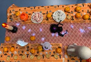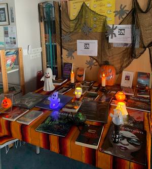 Les élèves du projet coopératif « Z’CDI » ont décoré l’espace avec différents éléments qui « font peur » : araignées clignotantes, fantômes, toiles d’araignées, citrouilles et compagnies. Une sélection de livres qui font peur était à disposition des élèves.