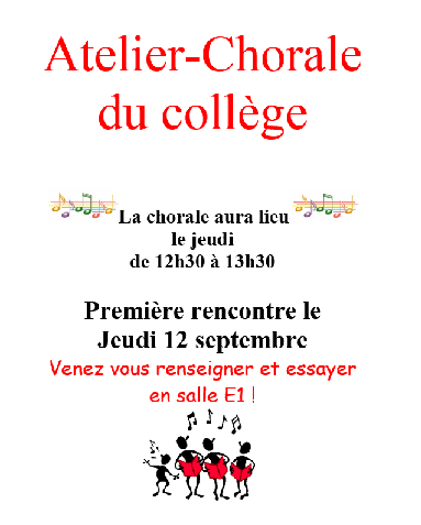 L'atelier chorale du collège reprend mardi 18 septembre 2018 entre 12h30 et 13h30.