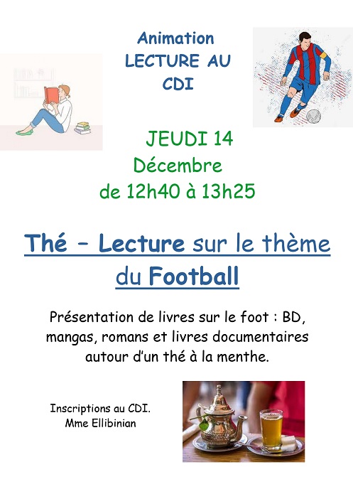 Le vendredi 15 décembre 2022, le Thé - Lecture" spécial Manga a eu lieu au CDI. Nous étions 15 élèves avec Mme Ellibinian. Nous avions 2 minutes pour présenter notre manga préféré. Certains élèves étaient là juste pour découvrir ce genre et pour avoir des conseils de lecture en tant que "lecteur de manga débutant". Nous avons parlé de nos lectures tout en dégustant les cookies réalisés par Lolita et les sablés de Jade et en buvant un thé à la menthe. Hava avait porté un super appareil photo pour faire un reportage sur notre action.