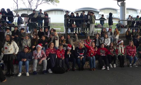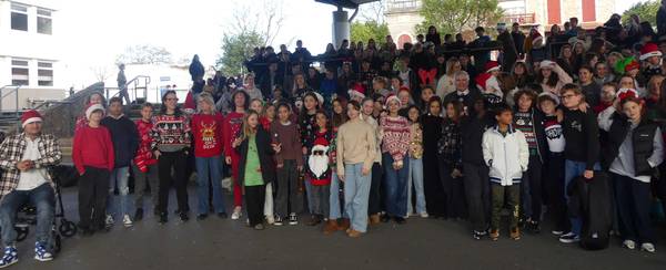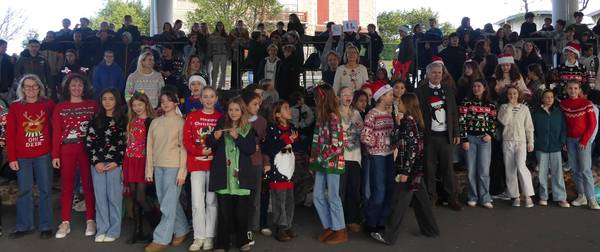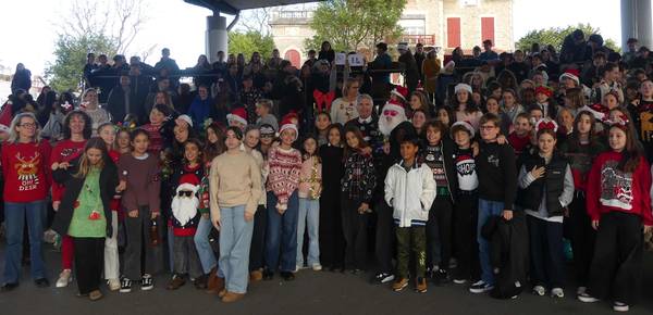 « Ce beau collège de Biarritz, le Collège Jean Rostand. Rempli de surveillants, de professeurs et de membres du personnel avec un esprit de Noël tellement beau... Ces élèves qui ont l'envie de célébrer Noël ! Une inspiration de notre chère CPE, Mme Saffore, que d'organiser un événement où la personne qui saura le mieux célébrer Noël sera celle avec le pull avec le plus d'inspiration. Revenons à cette magnifique photo, voyez-vous ces élèves qui ont la joie ? Ceci est le collège Jean Rostand. »