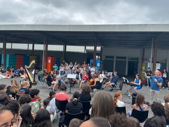 À l'occasion des 40 ans de la fête de la musique, les élèves de la classe à horaires aménagés musique organisaient une heure de concert ce mardi 21 juin avec au programme deux morceaux et deux chants extraits de "La fugue irlandaise" (jouée quelques semaines plus tôt au Zénith de Pau dans le cadre des rencontres chorales 2022).