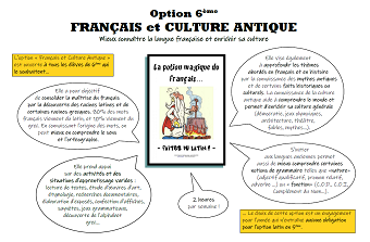 Le nouvel enseignement optionnel de "Français / Langue et Culture de l'Antiquité" en 6e sera expérimenté cette année en 6e5, 6e6 et 6e7. Deux heures hebdomadaires seront proposées.
