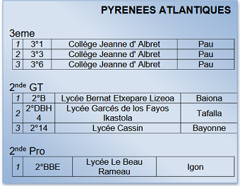 Bravo aux trois classes du collège Jeanne d'Albret qui occupent les trois premières places du rallye mathématiques à l'échelle du département, et qui ont reçu leurs prix lors d'une cérémonie qui s'est tenue le mercredi 15 juin au Parlement de Navarre.