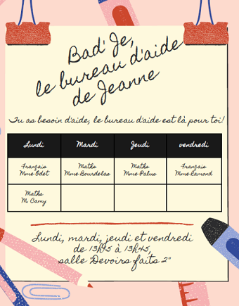 À compter du lundi 9 mai, le collège lance le bureau d'aide de Jeanne, chaque lundi, mardi, jeudi et vendredi.