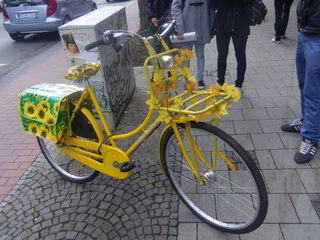 A Münster, les vélos sont rois! Ils sont les pieds des gens pour se déplacer. Nous aussi, on roule en "Fahrrad". Romuald, lui, il se croit sur une Harley Davidson, tellement les guidons sont hauts.
