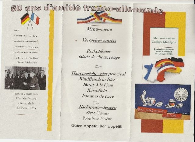 A l’occasion de la célébration du 60ème anniversaire du traité de l’Elysée, traité d’amitié signé au palais de l’Elysée entre le président Charles de Gaule et le chancelier Konrad Adenauer le 22 janvier 1963, le collège de Montpon s’est mis aux couleurs de l’Allemagne pour célébrer cet événement !