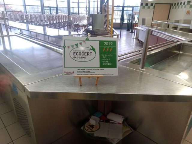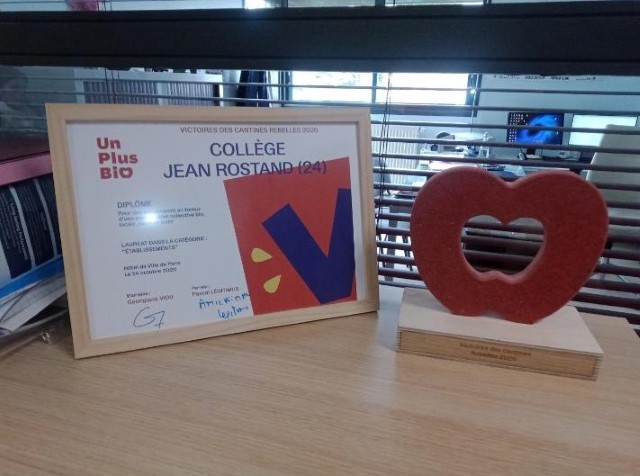 En effet les menus sont choisis grâce à une fiche annuelle sur laquelle des plats déjà existants peuvent être proposés. Puis après s’être mis d’accord avec son équipe, il envoie les menus à une diététicienne qui les valide trois semaines avant que vous les dégustiez. Un inspecteur peut passer de façon aléatoire 3 fois par mois. Et chaque jour, un repas témoin, « le mort », est prélevé et conservé pendant 3 jours au cas où un ou plusieurs élèves seraient malades. Comme vous devez sûrement le savoir, le collège sert des produits bios et locaux depuis 2019. Le chef cuisinier et 2 de ses collègues sont d’ailleurs montés à Paris pendant 2 jours en 2020 ; où ils ont reçu le diplôme « Un Plus Bio » et ont fini 1er comme Toulouse. Le parrain est Pascal Légitimus, comédien et membre du groupe d’humoristes « Les Inconnus » et sa marraine Georgiana Viou, grande chef culinaire française. Le diplôme certifie que les produits sont bio et locaux. C'est un lauréat dans la catégorie « établissement ».