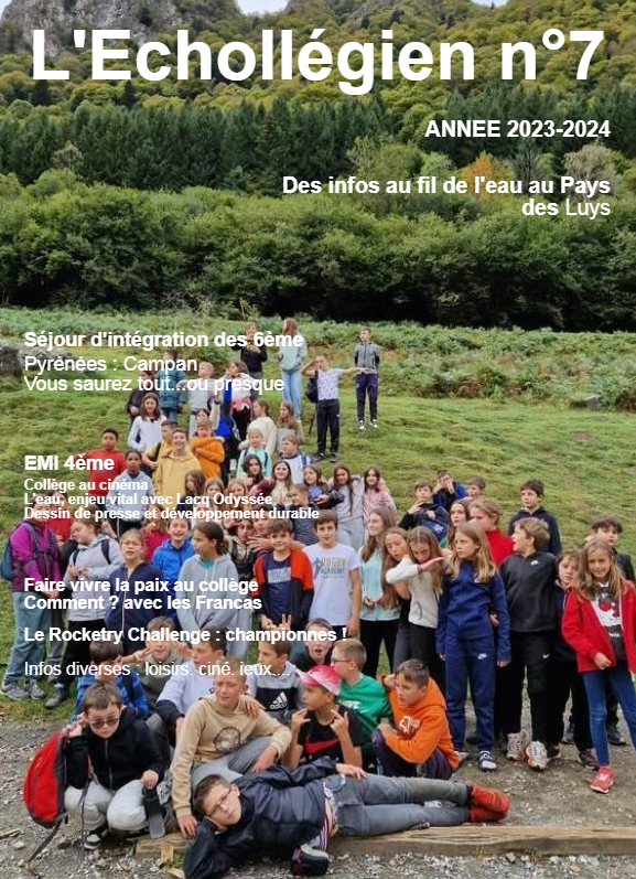 Découvrez l'Echollégien n°7, journal du collège réalisé par les élèves sous l'impulsion de Mme Delmas, documentaliste. Ce numéro de 59 pages abordent des actions entreprises durant l'année 2023/2024. Pour y accéder, cliquez sur le lien suivant :