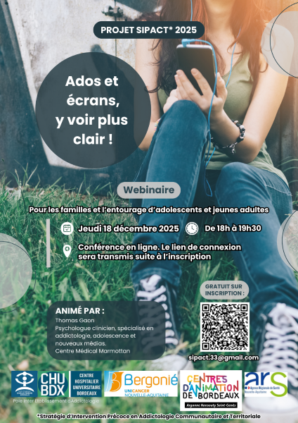 Le projet SIPACT organise un webinaire à destination des familles et entourage des adolescents et jeunes adultes, intitulé Ados et écrans, y voir plus clair, le jeudi 18 décembre 2025 de 18h à 19h30. Il sera animé par Thomas Gaon, Psychologue clinicien, spécialisé en addictologie, adolescence et nouveaux médias au Centre Médical Marmottan et par l'équipe SIPACT. Il est gratuit sur inscription.