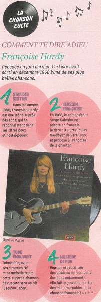 Pour autant, il n'y a pas que ça dans Okapi. Une rubrique est consacrée à la série à succès Emily in Paris (très caricaturale, niaise et qu'on aime regarder). Et plus précisément à sa bande son. Pour donner une image plus douce que le rock de Springsteen (voir hier), je vous propose d'écouter Tous les garçons et les filles, (chanson niaise et qu'on aime écouter) interprété par Clio. Pour mémoire, cette chanson a été écrite en 1962 par Françoise Hardy, chanteuse décédée en juin dernier (voir le billet du 13 juin) et qui reste l'un des symboles français à travers le monde, d'où l'utilisation de sa chanson dans cette série américaine à succès (et que seules les personnes qui ne sont jamais allées à Paris peuvent prendre au sérieux...).