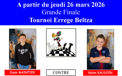 Hier, je suis passé un peu vite sur le tournoi d'échecs Errege Beltza. Il est temps de faire le bilan. Je n'insisterai pas sur la prestation des filles, déjà très peu présentes parmi les concurrents (elles n'étaient que six), aucune n'est parvenue à la phase d'éliminations directes. Si je ne devais qu'en distinguer une, ce serait Louisa Lambert (en Sixième) qui, en phase de poules a mis en difficulté Lucas Garcia Leva qui ira jusqu'en demi-finale. Ce tournoi attend toujours celle qui succédera à Léa Lerchundi, seule fille inscrite au palmarès et victorieuse en 2009 (aussi incroyable que cela puisse paraître, en 2009, j'étais déjà né)...