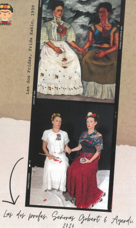 Frida Kahlo est une artiste que les élèves connaissent forcément à la fin du Collège. Je vois mal à quel moment, avec Mme Ayerdi et Mme Christy (enseignantes d'Espagnol) ils pourraient y échapper. Et s'il n'y avait qu'elles... Mme Cledon voue un véritable culte (en exagérant à peine) à l'artiste mexicaine...