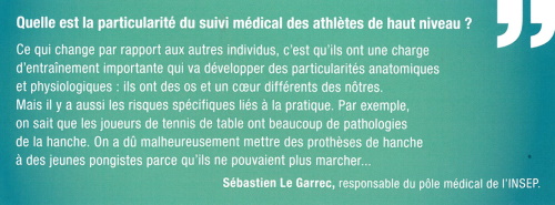 Et certains sports, parfois, déconsidérés, sont mis en avant. Regardez ce qu'un médecin du sport dit du tennis de table. Quand je pense que certains (au collège, parmi les adultes) ont un sourire moqueur pour cette discipline (Quoi ? Le ping pong, un sport ?). Et je ne parle de la mortalité réelle qui pourrait exister (ou pas) parmi les pratiquants (mais, l'honnêteté m'oblige à préciser qu'il me manque des statistiques précises sur ce sujet).