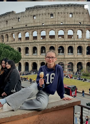 Le Colisée à l'arrière, la glace, le sourire... Y a-t-il une meilleure image d'élève heureuse que Lola (élève de Cinquième) à Rome avec les latinistes de Mme Beguerie ? Ils rentrent tout à l'heure...