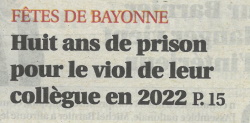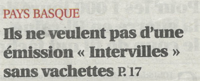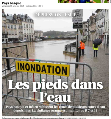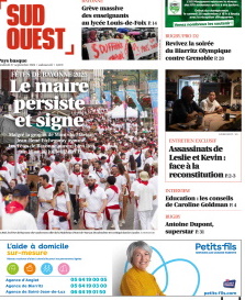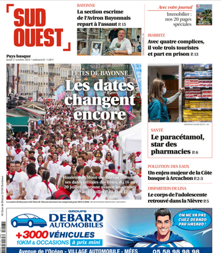 Je sais bien que je n'ai fait aucune école de journalisme et que mes compétences en la matière sont proches du néant, mais je me demande, en ces temps troublés (guerre au Proche-Orient, en Ukraine, nouveau gouvernement, faits divers épouvantables, procès horribles), si l'information la plus importante sa cache dans le choix des dates des Fêtes de Bayonne, car, en les plaçant en Une d'hier et d'aujourd'hui, les journalistes de Sud Ouest semblent nous dire que c'est le cas, et on peut raisonnablement ne pas être d'accord. Qu'est-ce qui m'a pris de faire une phrase aussi longue ? En même temps, peut-être est-ce l'info qui sera la plus commentée par les lecteurs du Pays Basque ? Et donc, celle qui intéresse le plus ? Décidément, être journaliste est un métier bien compliqué. Il faut informer et vendre suffisamment de journaux pour pouvoir en vivre.