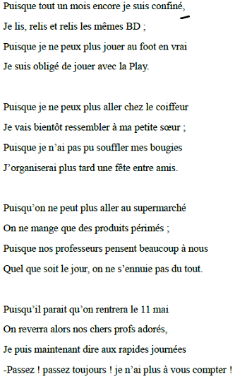 Les élèves de 4ème B ont eu à réaliser une production sur l'écriture par imitation à partir du poème "À ma Juliette" de Victor Hugo, sur le thème du confinement.