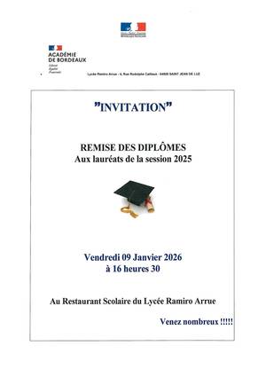 Le Lycée des Métiers Côte Basque Ramiro Arrué de Saint-Jean-de-Luz a l’honneur de convier les lauréats de la session 2025, ainsi que leurs familles, à la cérémonie officielle de remise des diplômes.
