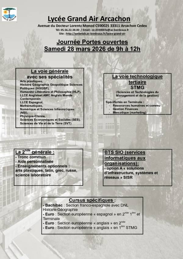 Situé dans la ville d’hiver d’Arcachon, au milieu de la pinède (17 ha de terrain), le lycée Grand Air est l’unique lycée général et technologique du Sud Bassin d'Arcachon. Il a été créé en 1939, lorsque le proviseur du Lycée Montaigne, voulant mettre à l’abri les élèves de son lycée, décida de faire de quelques villas de la ville d’Hiver une annexe de son lycée. Ce n’est que le 23 mars 1952 que le lycée sera officiellement inauguré.