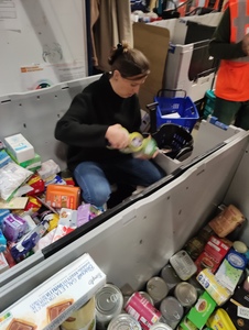 Parmi les élèves présents, certains qui avaient participé à la collecte, d'autres qui ont voulu s'investir pour donner de leur temps et de leur énergie. Il s'agissait ce jour là d'ouvrir les bacs contenant les dons, et de répartir chaque chose dans le box adéquat : conserves de légumes, biscuits secs, pâtes...