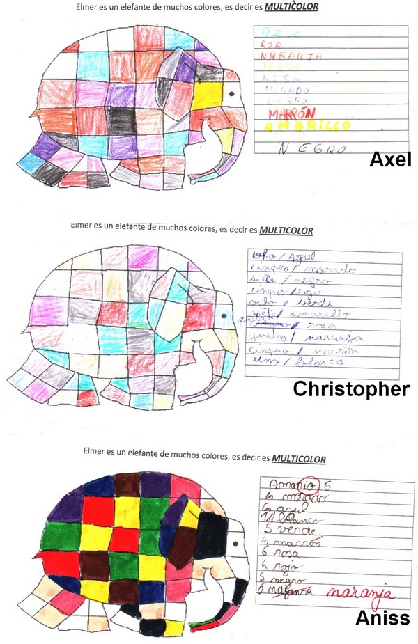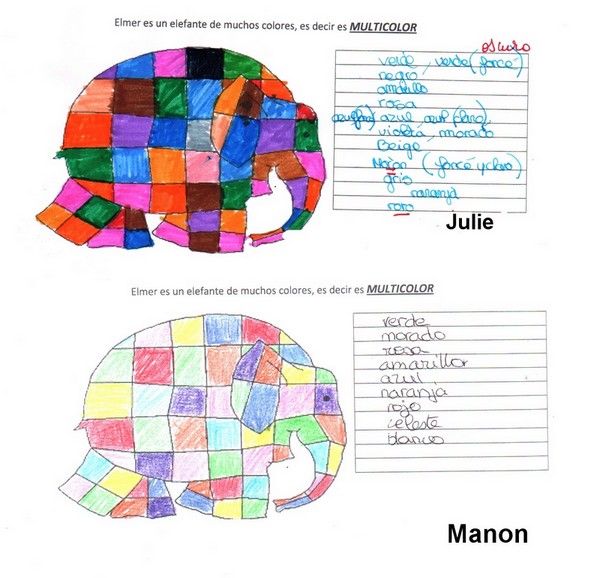 Après avoir travaillé en espagnol avec Emilia, l'assistante, sur les couleurs et un conte bien connu, les élèves de 6ème 2 ont illustré : "Elmer, el elefante multicolor".