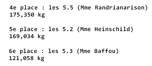 Pour ce qui est du Défi 5èmes, les 5.6, avec Mme Elzière, sont en tête pour l’instant, avec 199,480 kgs en valeur compensée.