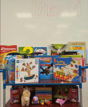 Grâce à l'opération Collecte pour le Noël des Restos du Coeur, menée par les 6e1 et leur professeur Monsieur Gouel, plus de 150 jeux et jouets, ainsi que 170 livres ont été récoltés.